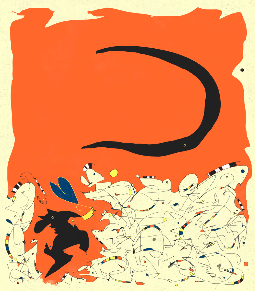 In Late Night Love, omentejovem tells a visual story of introspection. In the upper central part of the composition are the recurring motifs of ‘The Moon’ and ‘The Dot’, which the artist has imbued with philosophical significance, and which appear in many of his works. The moon, which can be seen as a symbol of the unconscious and a guide through the darkness (both as opposed to the sun), is rendered with a contemplative and huge presence (big and sketch-like in black and then very small but bright and with clear lines inside that bigger half-moon shape). The lunar element speaks to the cycles of creativity and reflection, a celestial body that is both witness and participant in the artist’s nocturnal dialogues with himself and his works.